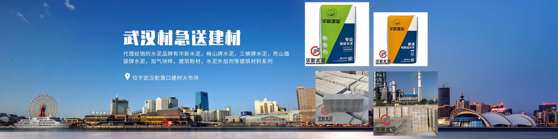 武漢材急送建材有限公司位于武漢舵落口建材大市場,是一家專業從事水泥批發,水泥外加劑,建筑粉材,加氣塊磚等建筑材料經銷代理商,代理經銷的水泥品牌有華新水泥,梅山牌水泥,三峽牌水泥,秀山雄駿牌水泥,加氣塊磚,建筑粉材,水泥外加劑等建筑材料系列。   武漢材急送建材有限公司成立于2016年,在武漢舵落口建材大市場擁有200平方米門面用于產品展示經營,1000多平方米倉庫隨時庫存各品牌水泥300多噸。
